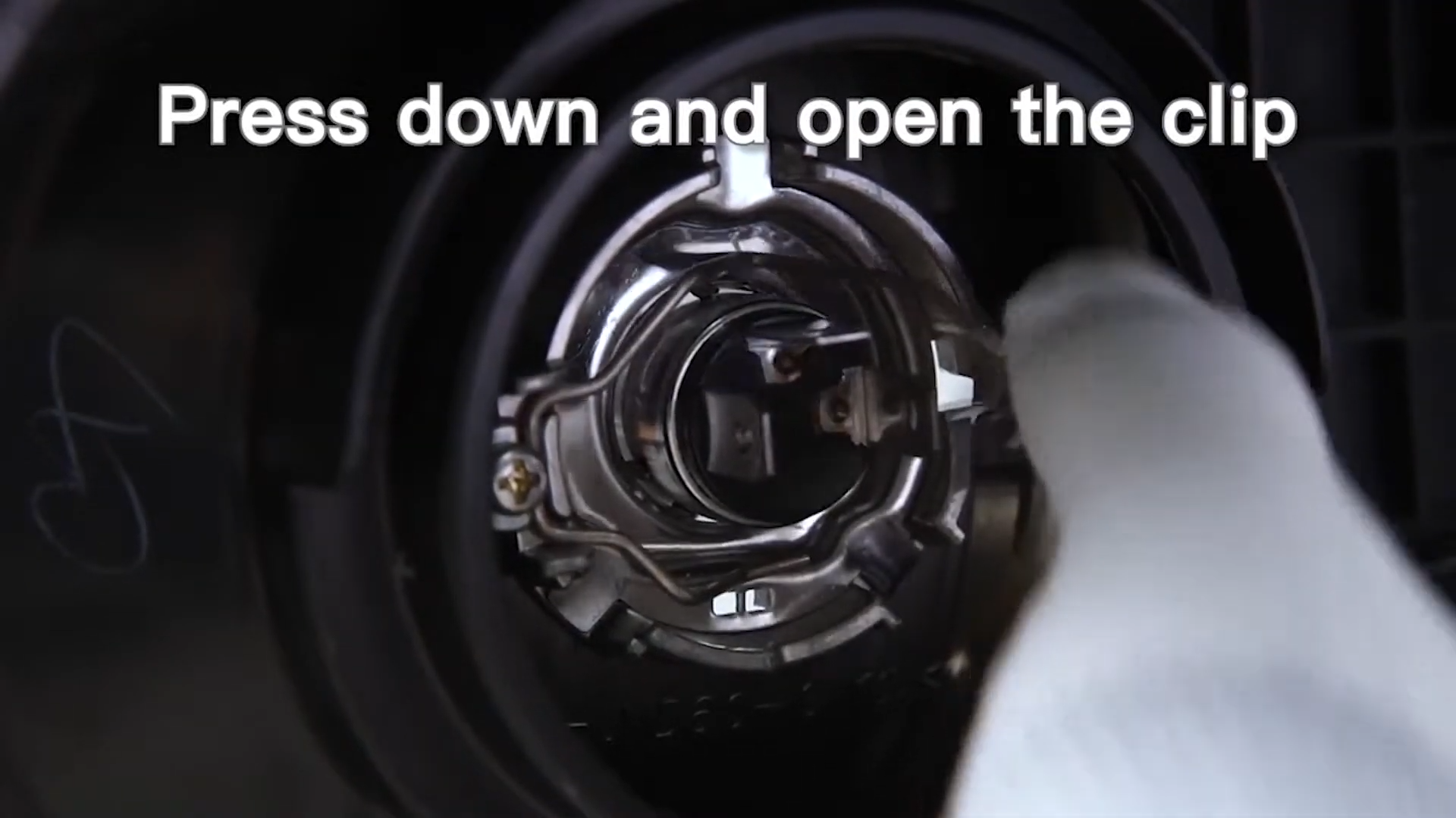 Next, locate the metal retaining clip that holds the bulb in place. Gently remove the clip by squeezing the sides to loosen it, and then pull it away from the bulb. Be careful not to force it as it can break, making it harder to replace.