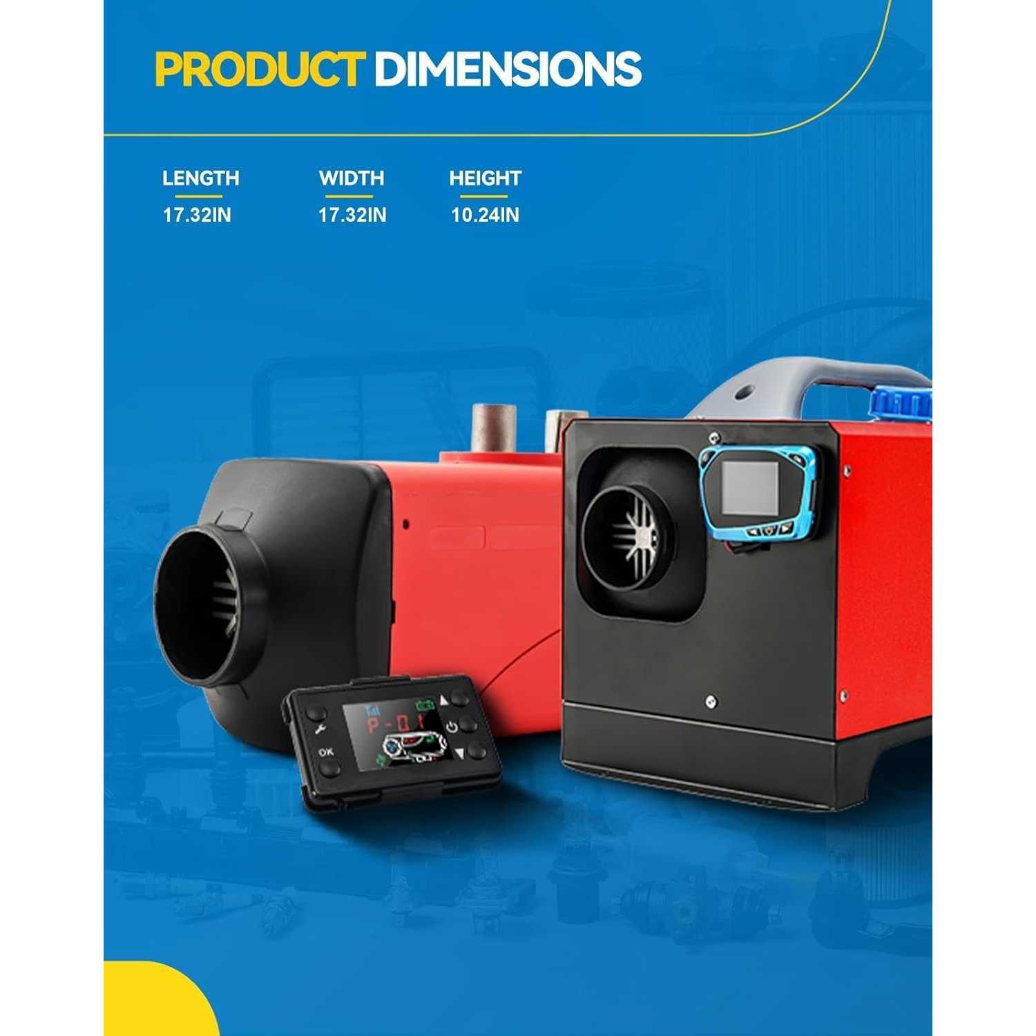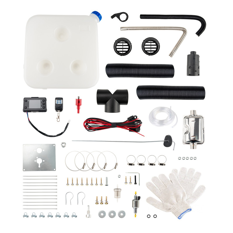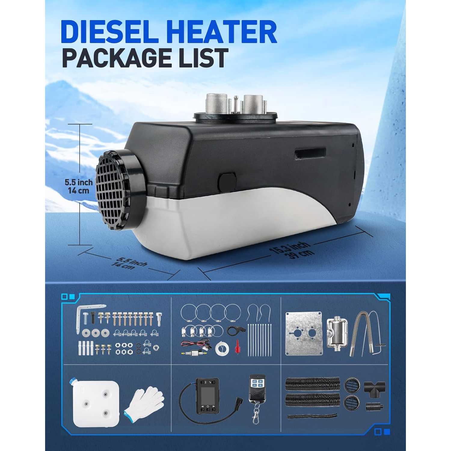 • ✨Package Contents: 1*English-German Bilingual Manual, a pair of Gloves, 1*25mm Hole Cutter;1*Diesel Air Heater, 1*LCD Switch, 1*Remote Control, 8*Dovetail Nail(12#, 30mm), 4*Fixing Screw;1* 10L Fuel Tank(with 3*Dovetail Nail, 3*Gasket, 2*seal Gasket, 1*Fuel Injector, 1*Fuel Injector Nut), 1*3m Fuel Pipe, 7*Oil Pipe Clamp, 1*Fuel Pickup, 1*Fuel Pump, 1*Fuel Pump Bracket, 1*Fuel Filter, 1*Mounting Plate, 1*Wiring Harness;2*75mm Air Outlet, 2*76mm Outlet Air Pipe(50cm long), 1*25mm Inlet Air pipe(50cm long), 1*25mm-diameter 50cm-length Exhaust Pipe(19.685*0.98 inch), 2*Inlet/Outlet Ducting Brackers, 1*Air Filter, 1*75mm Tee Fitting;1*Silencer(with 2*Dovetail Nail, 1*Nut, 1*Screw, 1*Fixing Plate);4*19-29mm small Ducting Clamps, 4*60-83mm big Ducting Clamps, 11*Zip tie, 5*6# Nut, 1*6# Screw