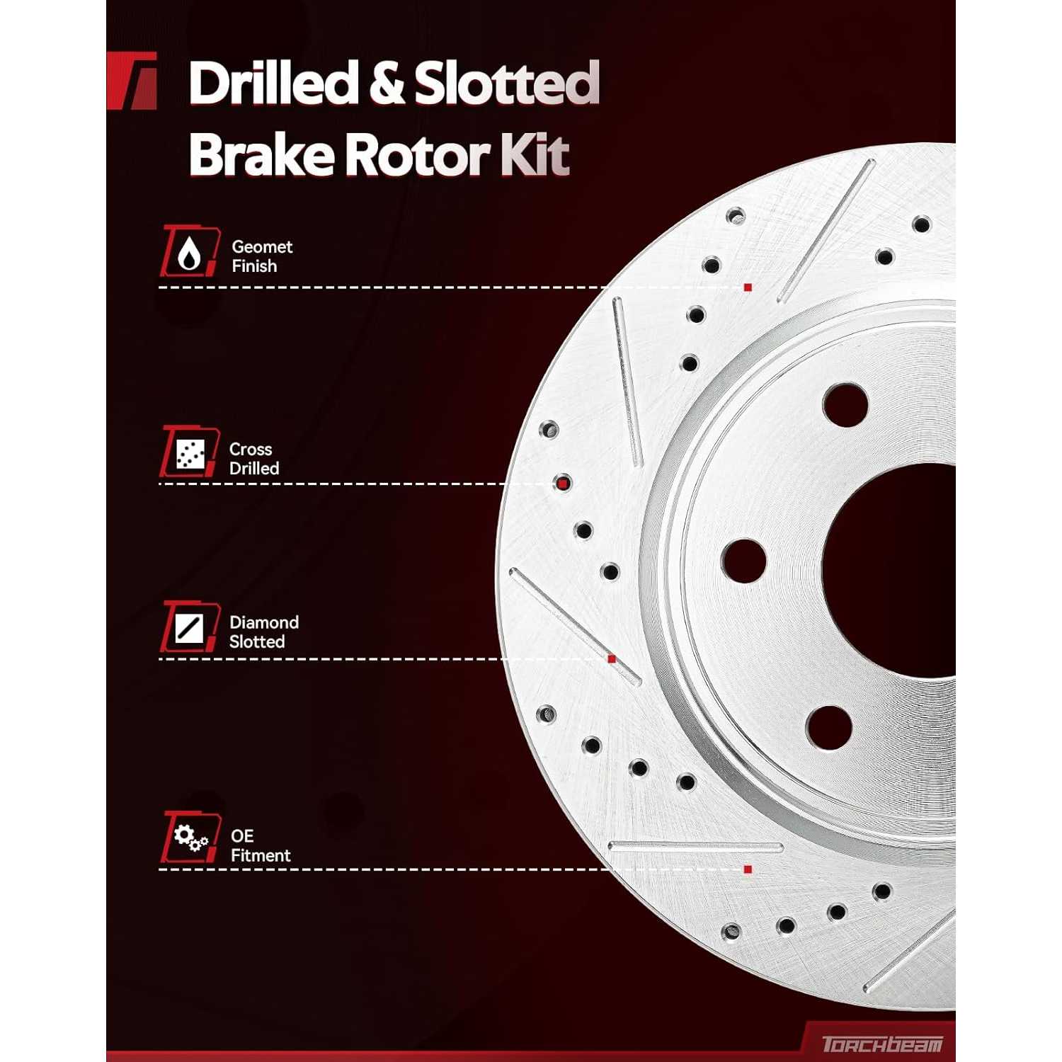 • (Performance Improvement):The brake discs rotors use drilling and slotting technology, which can not only enhance the dust exhaust function, but also improve the heat dissipation performance and keep stable in braking.