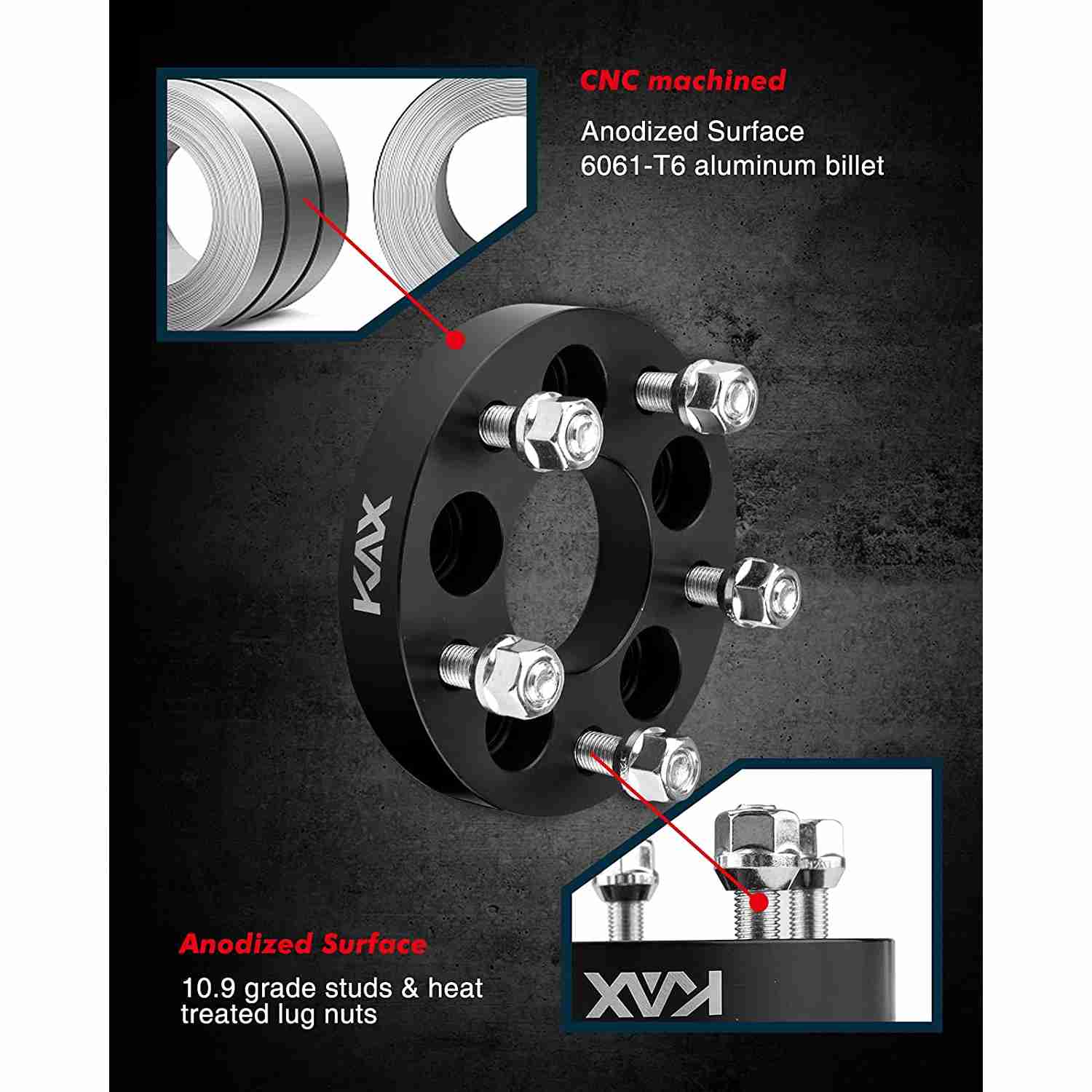 KAX Wheel Spacers are forged from anodized black 6061-T6 Aluminum alloy, making them more durable and corrosion resistant.