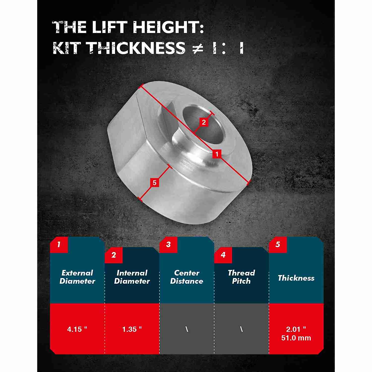 Note: The ratio between lift height and kit thickness is not 1:1, because of suspension geometry. The thickness of front lift kits is less than 2.25", but the leveling kits will actually raise the truck by 2.25".