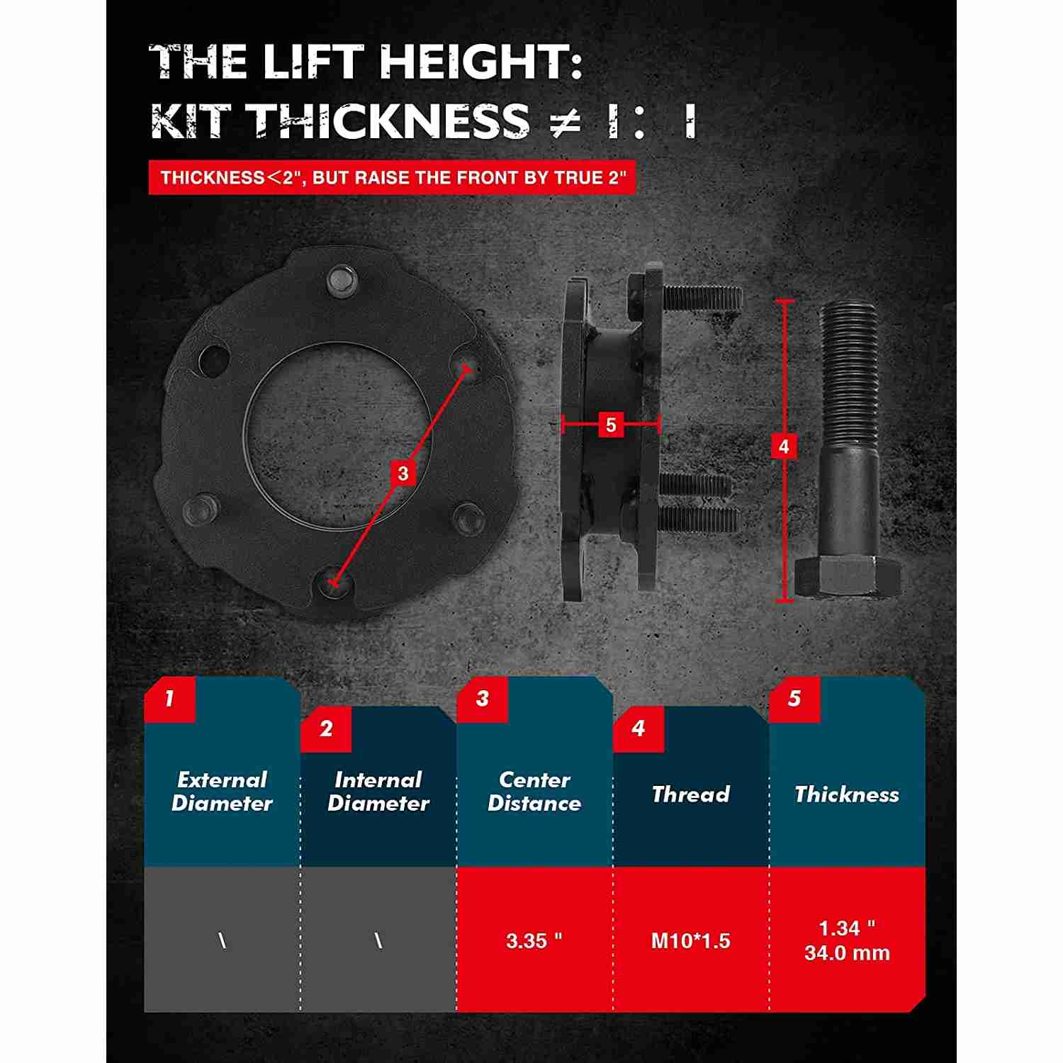 Note: The ratio between lift height and kit thickness is not 1:1, because of suspension geometry. The thickness of front lift kits is less than 2.25", but the leveling kits will actually raise the truck by 2.25".