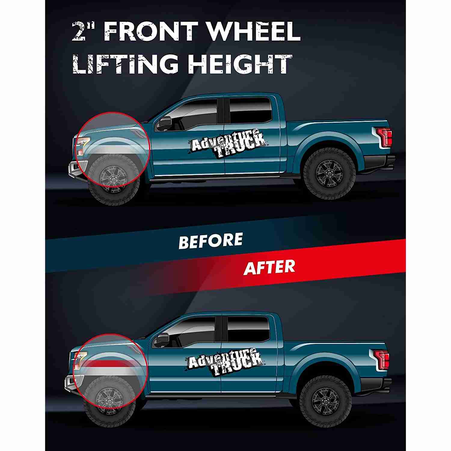 Note: The ratio between lift height and kit thickness is not 1:1, because of suspension geometry. The thickness of front lift kits is less than 2.25", but the leveling kits will actually raise the truck by 2.25".