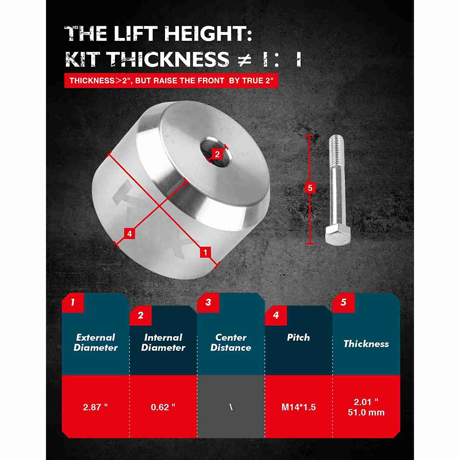 Note: The ratio between lift height and kit thickness is not 1:1, because of suspension geometry. The thickness of front lift kits is less than 2.25", but the leveling kits will actually raise the truck by 2.25".