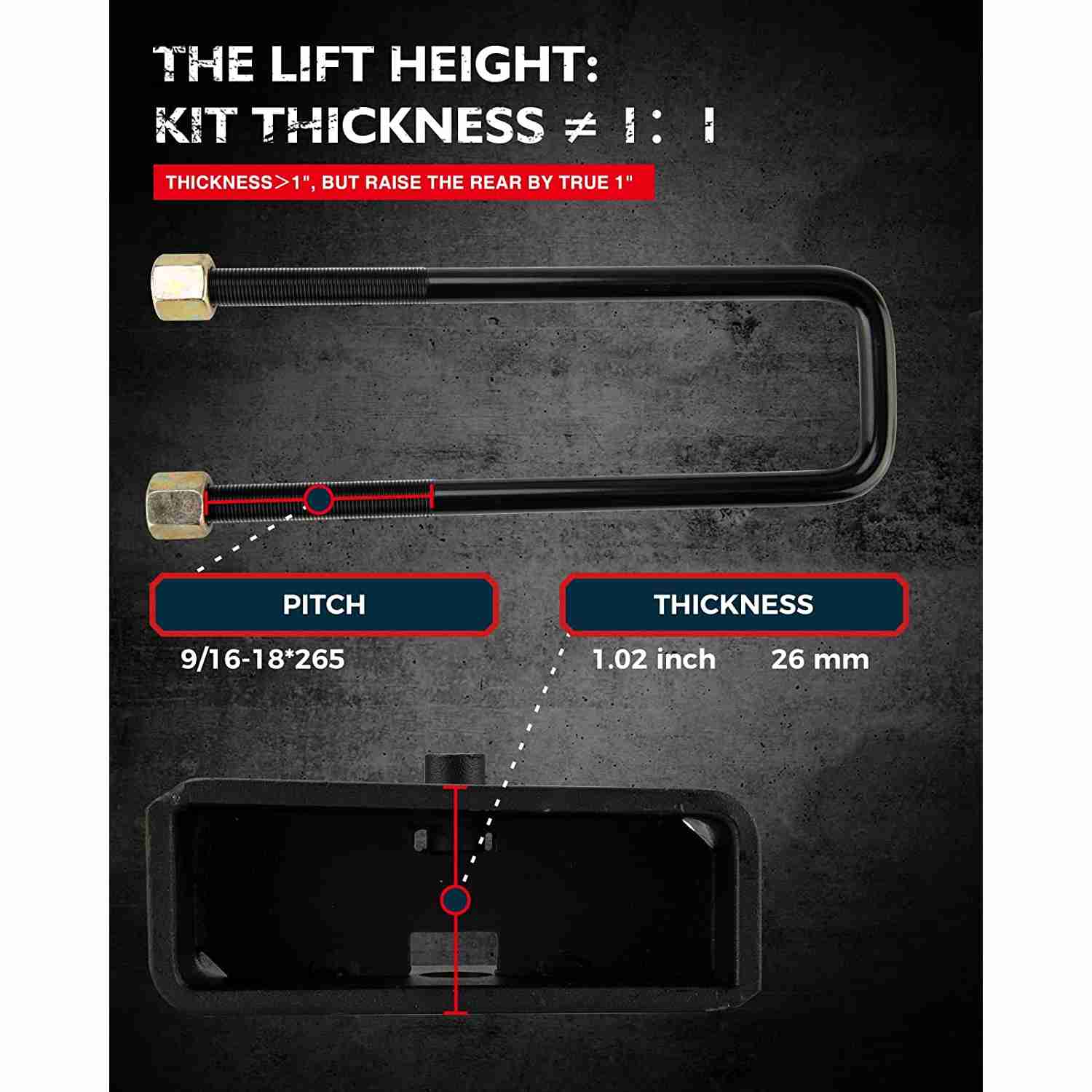 Note: The ratio between lift height and kit thickness is not 1:1, because of suspension geometry. The thickness of front lift kits is less than 2.25", but the leveling kits will actually raise the truck by 2.25".