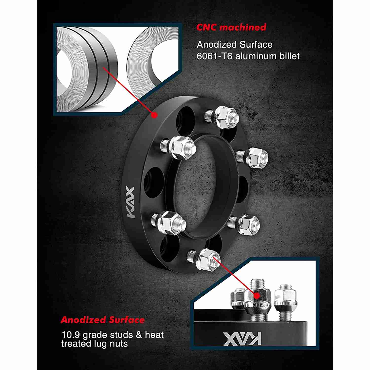 KAX Wheel Spacers are forged from anodized black 6061-T6 Aluminum alloy, making them more durable and corrosion resistant.