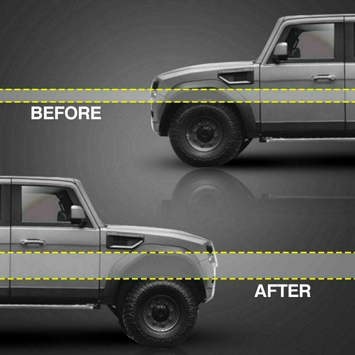 Note: The ratio between lift height and kit thickness is not 1:1, because of suspension geometry. The thickness of front lift kits is less than 2.25", but the leveling kits will actually raise the truck by 2.25".