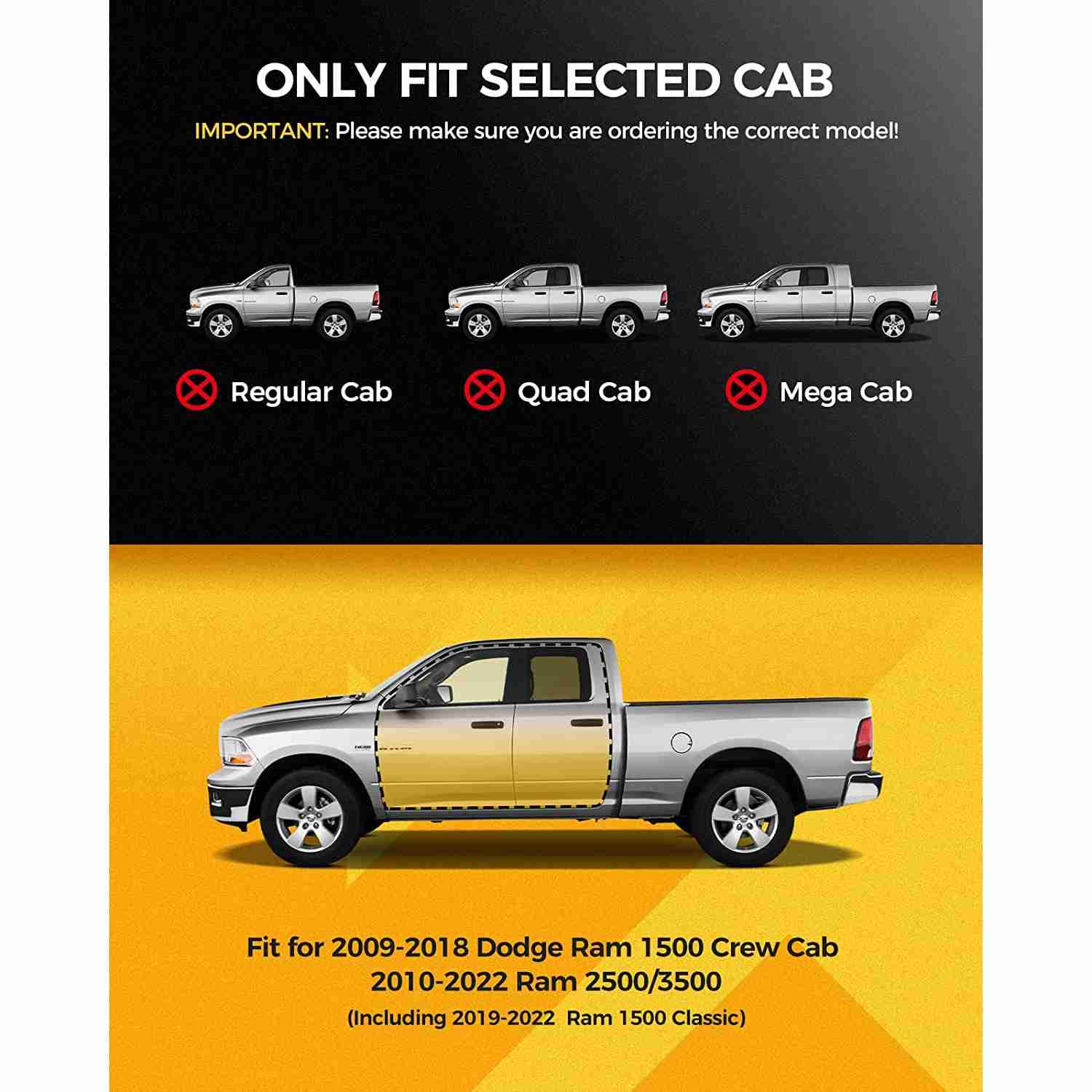 Compatible with 2009-2018 Ram 1500 Crew Cab 2010-2021 Ram 2500/3500(Including 2019-2022 Classic) and Dress up your vehicle (Please check the cab size before purchase)