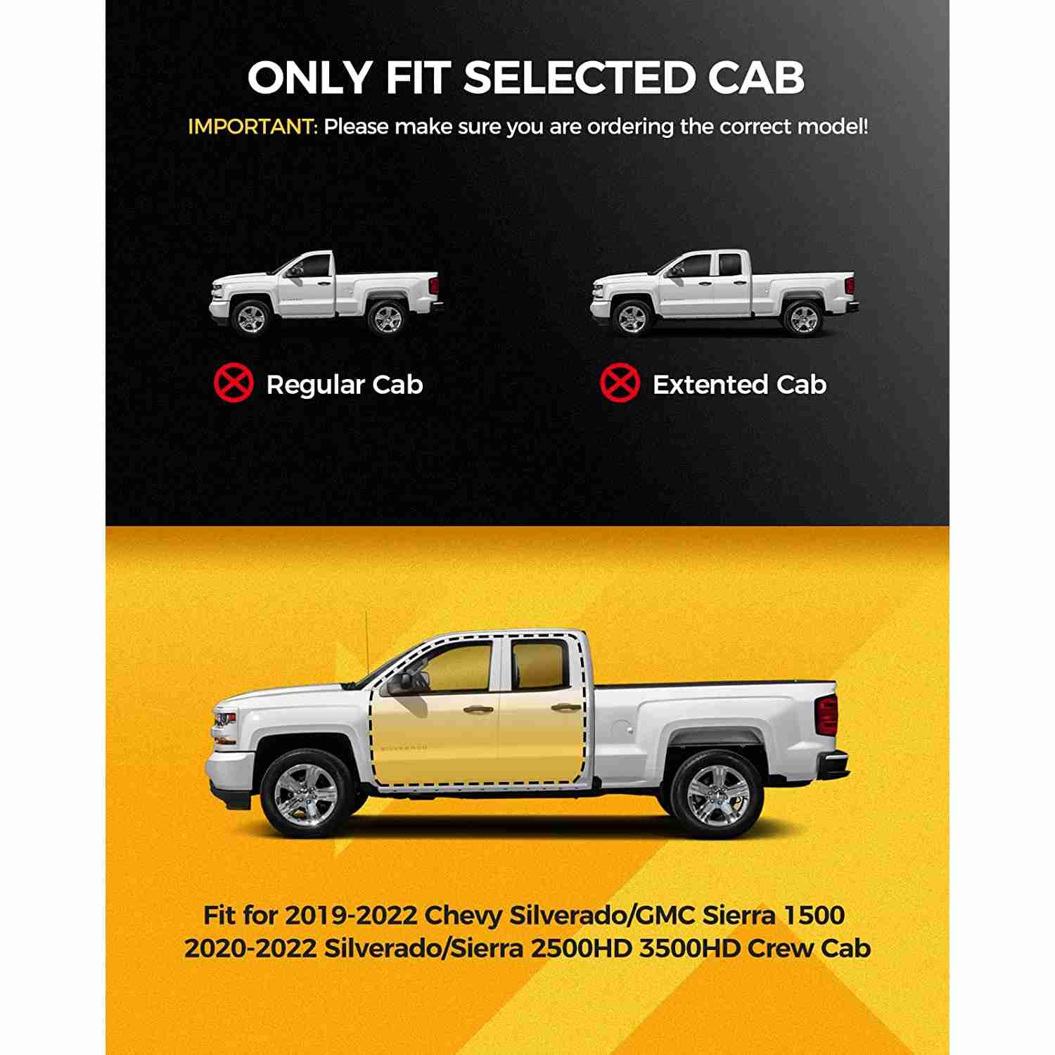 • Precise Fitment: Compatible with 2019-2022 Chevy Silverado/ Sierra 1500 & 2020-2022 Silverado/Sierra 2500HD 3500HD Crew Cab (Exclude 2019 1500 LD). Check the cab size before purchase