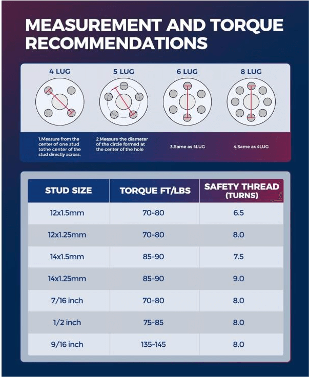 2. Avoid using an impact wrench; hand wrench is recommended. Improper usage may cause lug nuts/bolts to break or loosen while driving, which will take potentially accident or injury. Be sure to torque the lug nuts to manufacturer specifications.