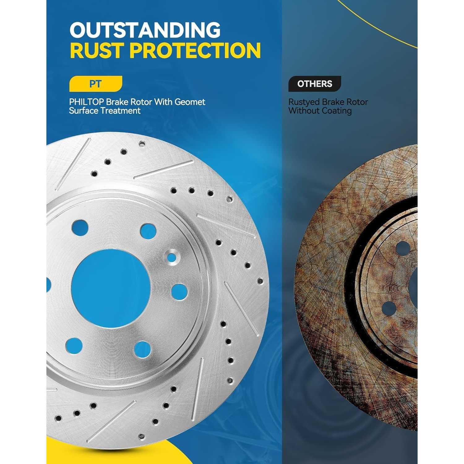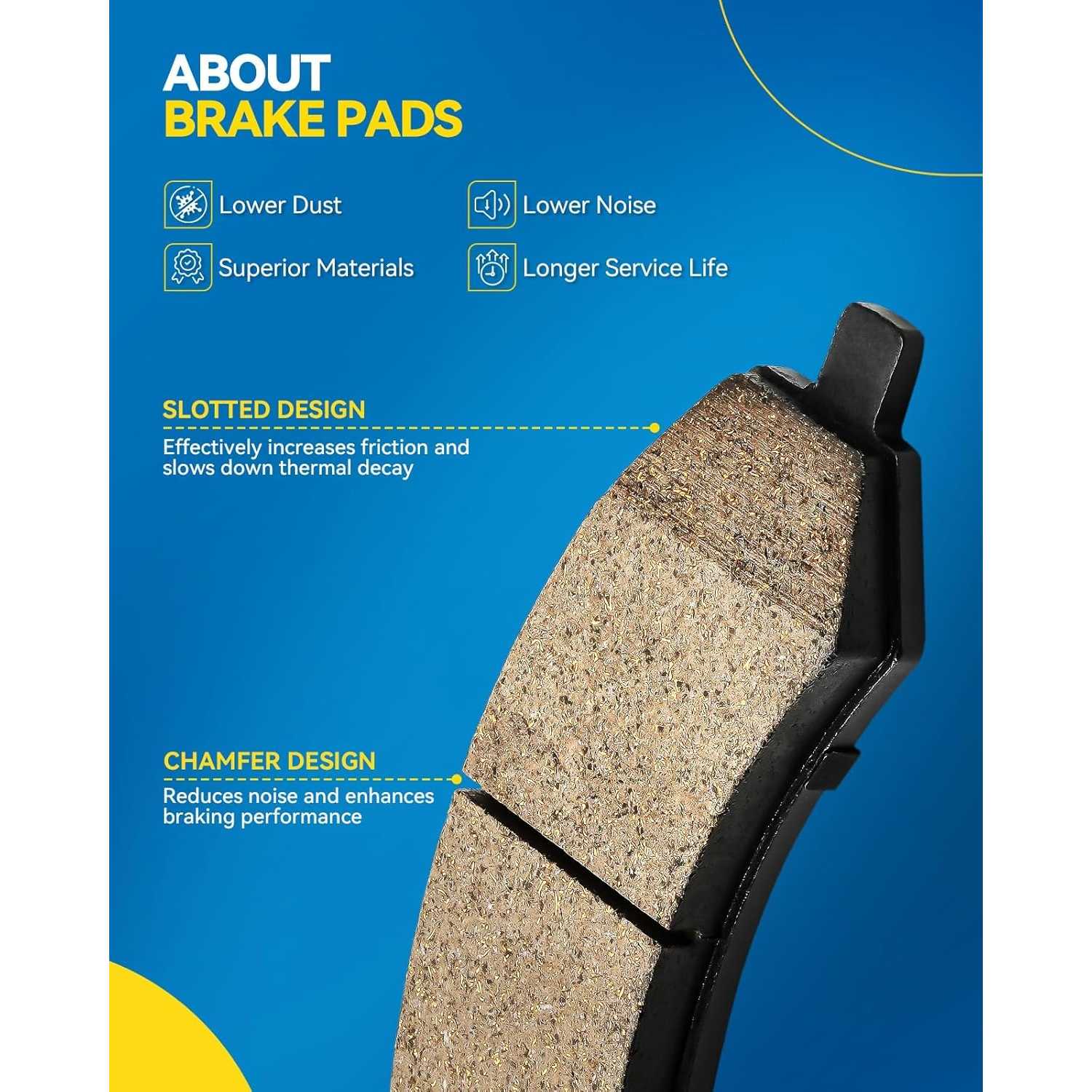 • (Superior Performance)Our brake pads are chamfered to reduce noise and vibration, achieve fast heat dissipation, and reduce thermal decay of the brake pads. An environmentally friendly Geomet surface treatment process is used to ensure corrosion resistance. Disc brake pads and rotors kit enhance braking performance by improving wear and durability through enhanced blending technology. Through rigorous testing and optimization, our products can maintain efficient braking over long periods of use.