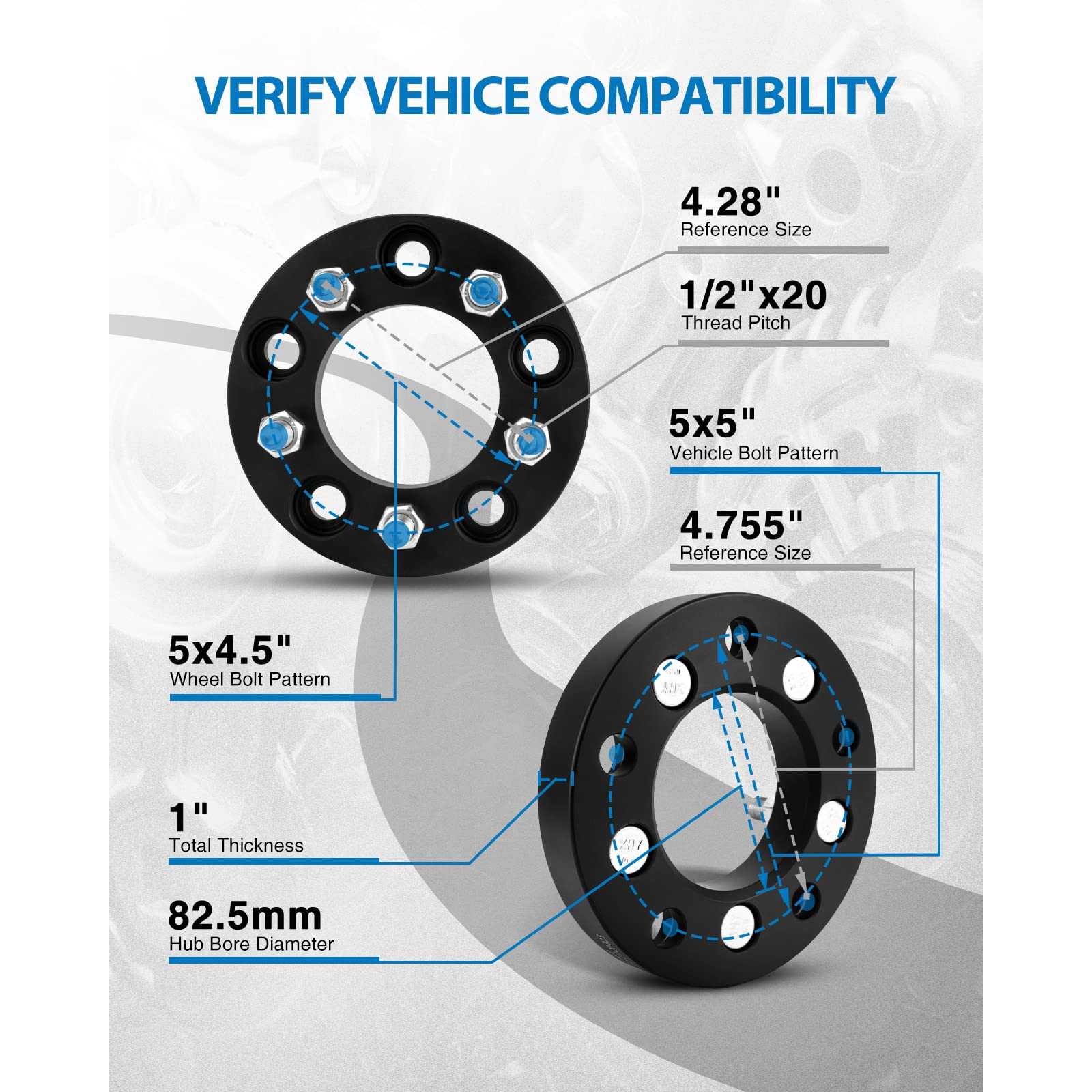 • (Wheel Adapters Specification) Vehicle Bolt Pattern:5x5(5x127mm), Wheel Bolt Pattern:5x4.5(5x114.3mm), Thread Pitch 1/2"x20, Thickness 1", Center Bore 82.5mm