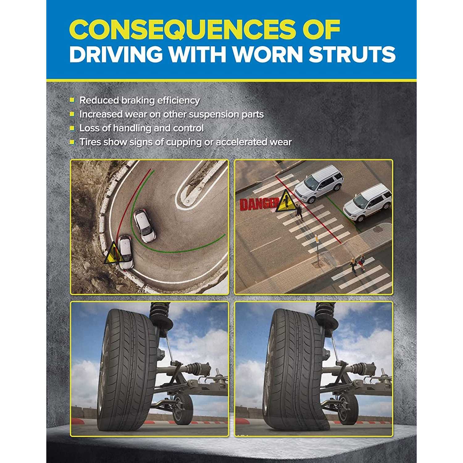 • Shorten Braking Distance: A new struts assembly helps maximize tire-to-road contact and distributes body weight evenly to each tire, which can shorten braking distances due to strut wear.