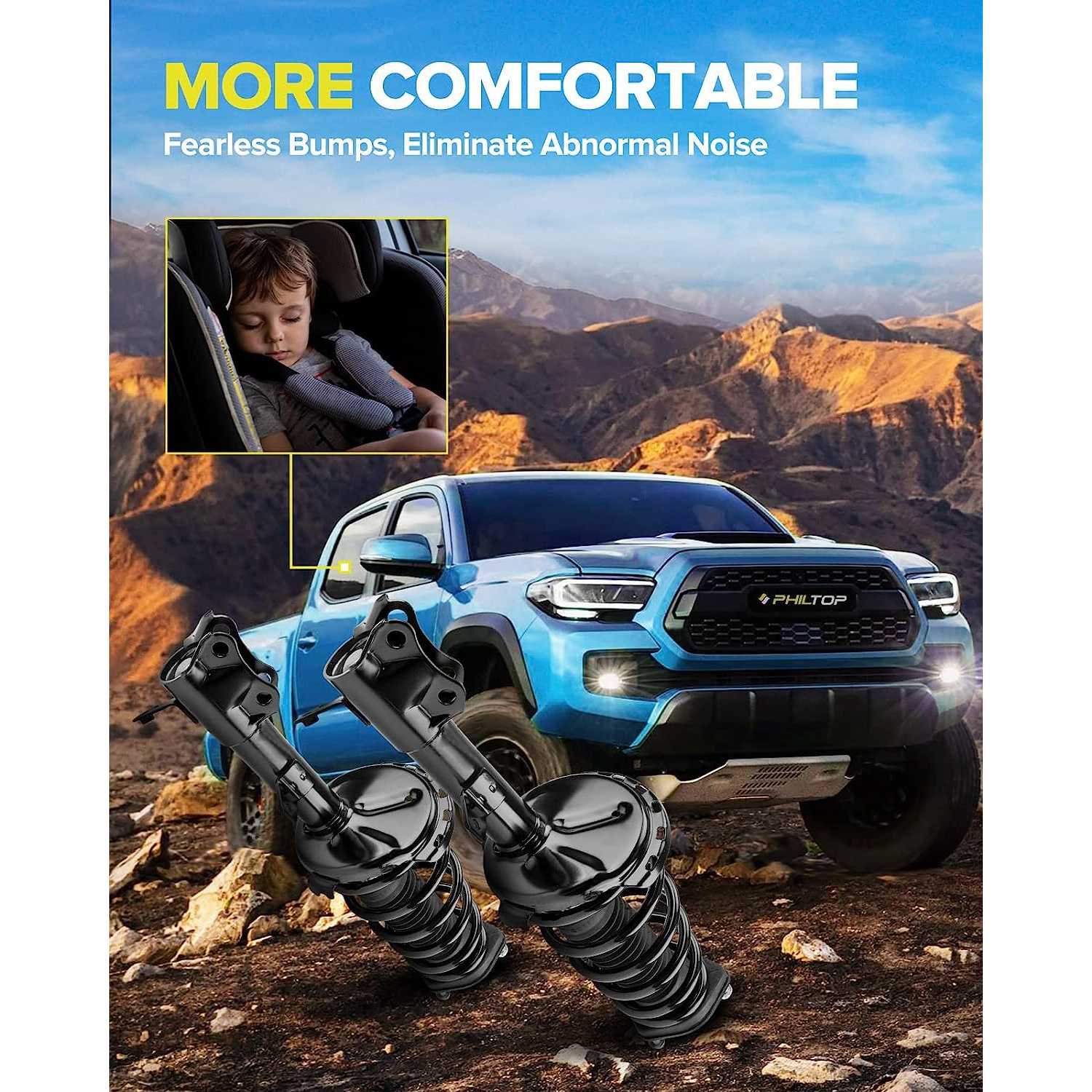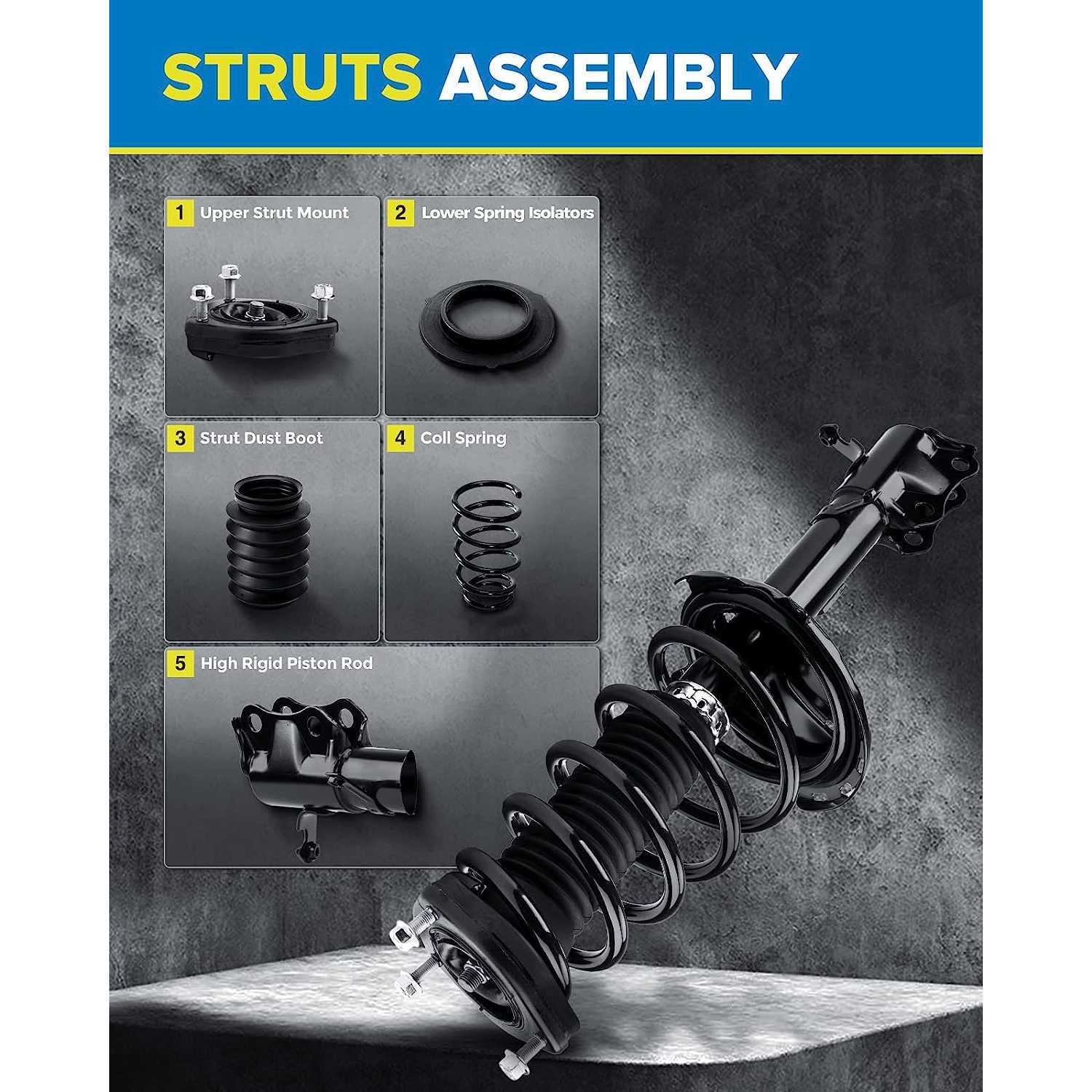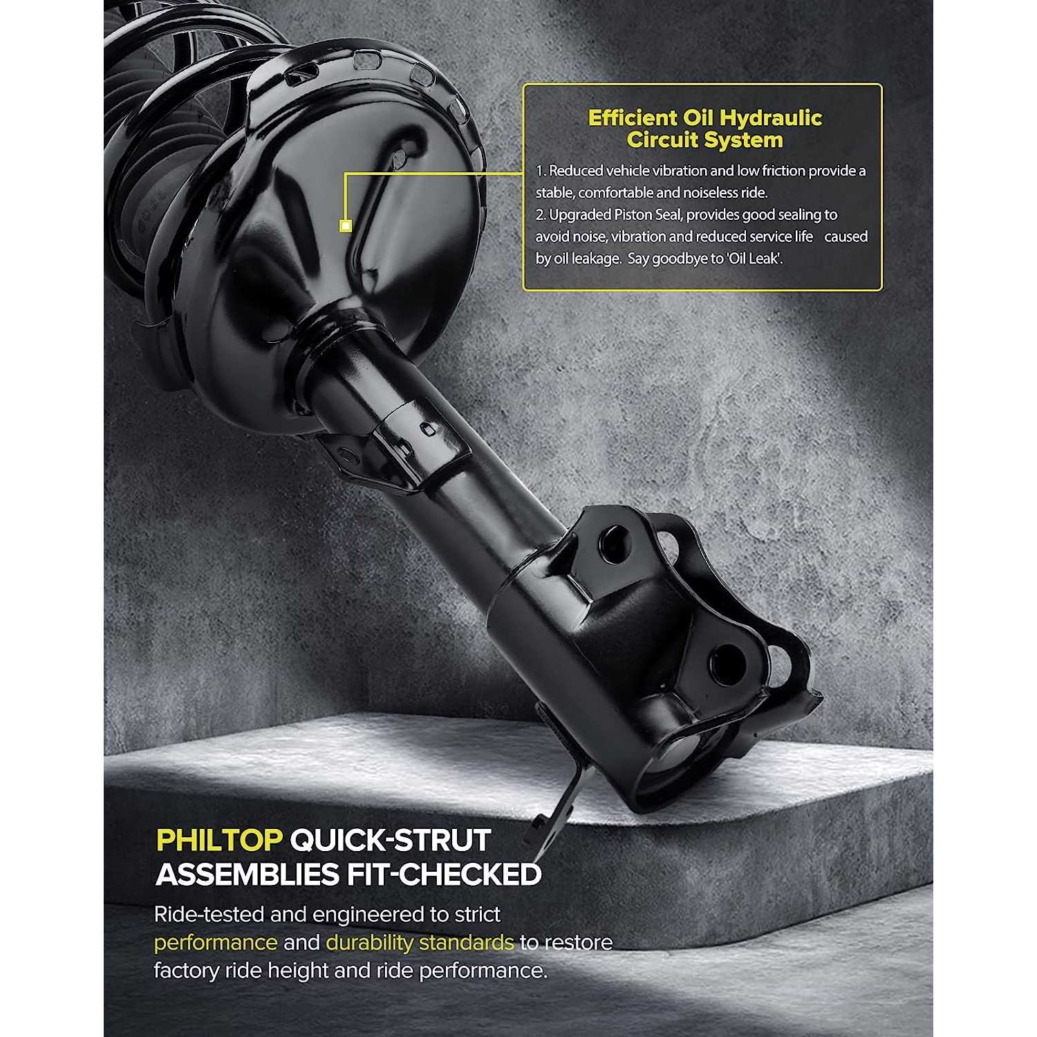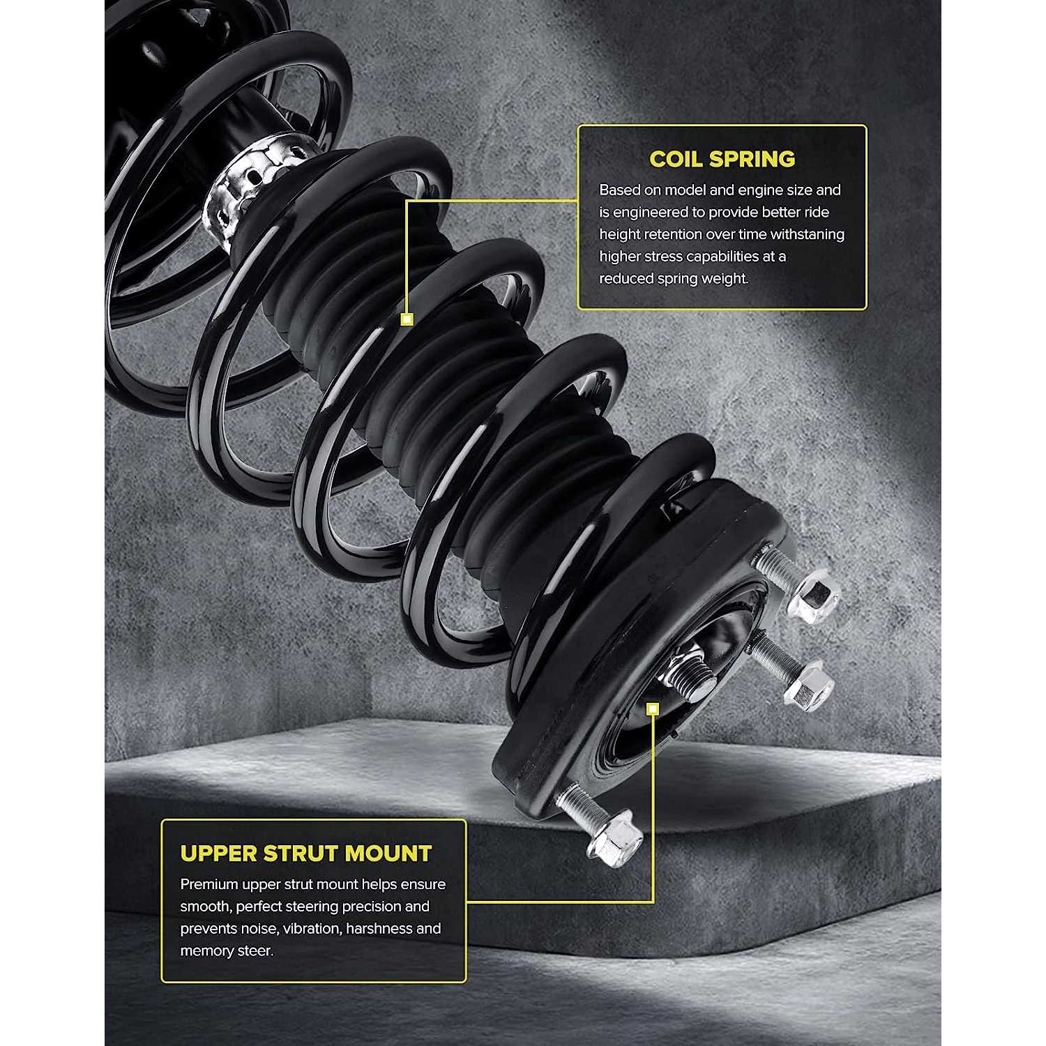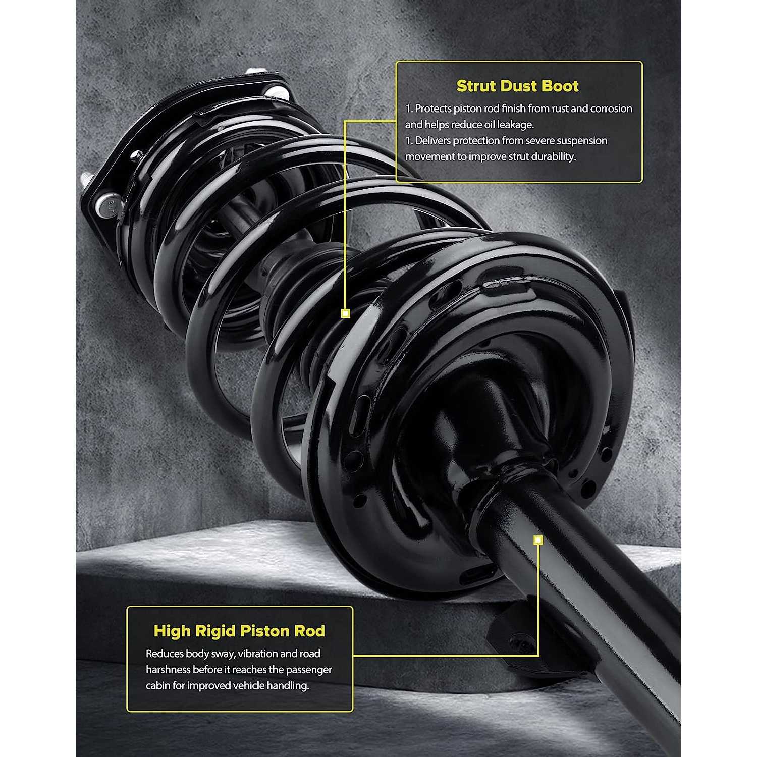 The complete strut&coil spring assembly will help to maintain a proper ride height, shorten the braking distance, increase tire grip, and alleviate and control the vibration of the vehicle body during driving, especially on a bumpy road and when steering to reduce the risk of side-over risk, thus improving the driving stability, security and experience.