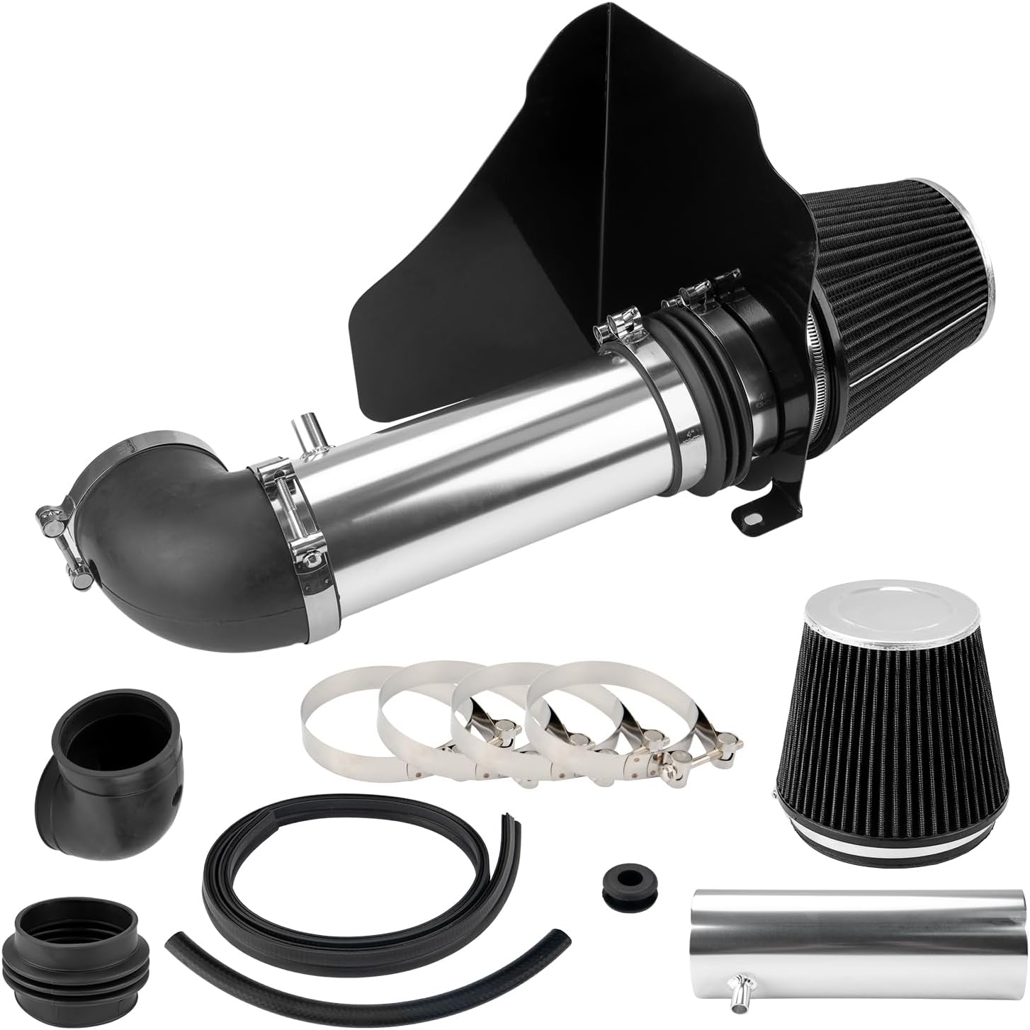 • [Sturdy Material] - Sturdy aluminum cold air intake kit with filter tubes and custom heat shields, mandrel-bent and powder-coated aluminum intake tubes help increase the amount of air flowing to your engine, while heat shields help protect the intake air from the high temperatures in the engine compartment.